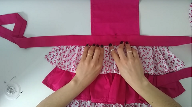 8. Encontre o meio do tecido da saia e posicione o tecido do avental. Costure.